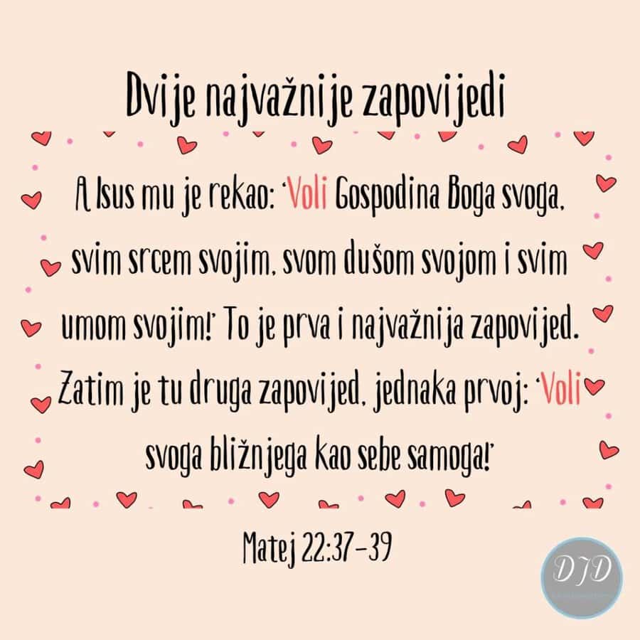Isusova smrt na križu bila je vrhunac Njegove neizmjerne ljubavi prema nama. Pokorio se Očevoj volji čak i kad je to značilo patnju do smrti i toliko nas je volio da je dragovoljno dao svoj život kako bi nas spasio od grijeha. Kad promatramo križ, vidimo da su u Isusu savršeno ispunjene obje najveće zapovijedi – ljubiti Boga svim srcem, dušom i umom te ljubiti bližnje. Zanimljivo je primijetiti da se zapovijed o ljubavi prema drugima temelji na našoj prirodnoj ljubavi prema samima sebi. Danas se puno govori o samopoštovanju i o tome kako učiti djecu da vole sebe, ali u stvarnosti nitko ne mora učiti dijete kako biti sebično. Svi prirodno želimo biti voljeni, nahranjeni, odjeveni i sretni. Ova zapovijed ne znači da ne trebamo voljeti sebe, već da trebamo voljeti druge kao što volimo sebe – na isti način na koji želimo biti nahranjeni, voljeni i utješeni, trebamo hraniti, voljeti i tješiti druge. Isusova ljubav bila je žrtvena i nesebična. Takvu ljubav trebamo davati i drugima.