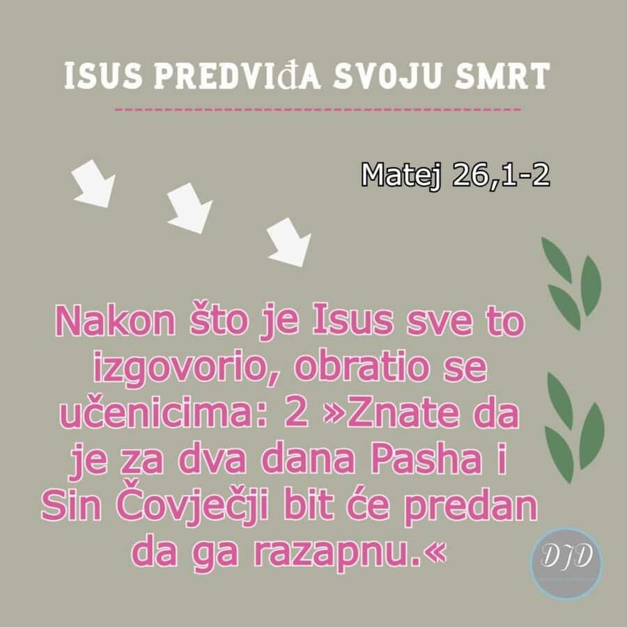 Pasha dolazi,i Isus je počeo pripremati svoje učenike za ono što će upravo doživjeti. Nije govorio u pripovijetkama kao prije,nego im je rekao jednostavno da će za dva dana umrijeti. Isus je bio potpuno svjestan što ga je čekalo.