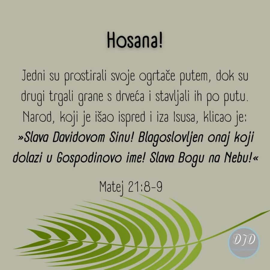 Ovaj ulomak često se naziva Isusovim svečanim ulaskom u Jeruzalem i ispunjava proročanstvo iz Zaharije 9,9. Ljudi su prepoznali Isusa kao obećanog Mesiju i klicali mu: „Hosana!“ Njihova su srca bila puna nade, ali ti isti ljudi koji su Mu tada klicali, samo pet dana kasnije vikali su: „Raspni ga!“