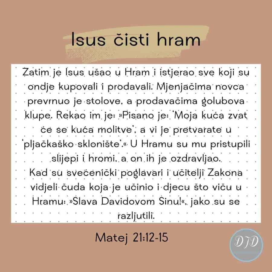 ali pretvoren je u tržnicu. Ljudi su kupovali i prodavali žrtvene životinje– ovce, golubove, golubice i goveda – kako bi ih prinjeli kao žrtve za Pashu. Isus je vidio pohlepu trgovaca i nazvao ih „razbojničkom jazbinom“. No, nije stao samo na tome – nakon što je očistio Hram, nastavio je liječiti slijepe i hrome. Djeca koja su to vidjela bila su zadivljena i klicala su „Hosana!“ Ali problemi su se nazirali, jer su glavni svećenici i pismoznanci to sve promatrali s nezadovoljstvom.